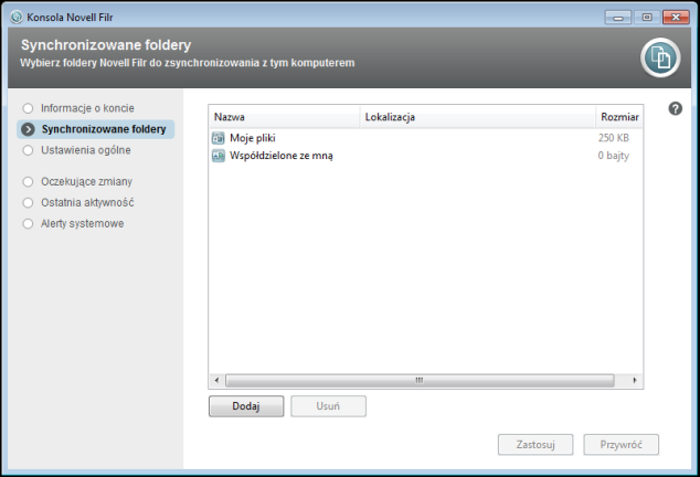 Podczas pierwszej konfiguracji aplikacji klienckiej Filr możesz wybrać synchronizowane foldery. Foldery Moje pliki i Współdzielone ze mną są synchronizowane domyślnie. Aby synchronizować foldery sieciowe, należy je skonfigurować ręcznie. Foldery do synchronizacji można skonfigurować podczas początkowej konfiguracji lub w dowolnym czasie po zakończeniu początkowej konfiguracji.