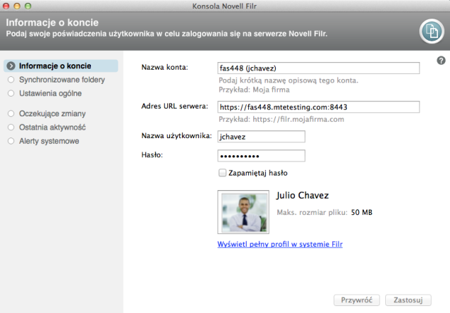 Informacje dotyczące konta aplikacji klienckiej Filr oraz informacje o serwerze Filr możesz zmienić w dowolnym czasie po zakończeniu początkowej konfiguracji: