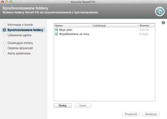 Podczas pierwszej konfiguracji aplikacji klienckiej Filr możesz wybrać synchronizowane foldery. Foldery Moje pliki i Współdzielone ze mną są synchronizowane domyślnie. Aby synchronizować foldery sieciowe, należy je skonfigurować ręcznie. Foldery do synchronizacji można skonfigurować podczas początkowej konfiguracji lub w dowolnym czasie po zakończeniu początkowej konfiguracji.