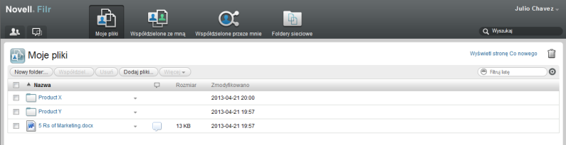 Przy pierwszym uruchomieniu systemu Novell Filr w przeglądarce internetowej zostaje wyświetlona strona Moje pliki. Na tej stronie możesz zarządzać wszystkimi utworzonymi przez siebie plikami.