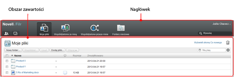 Obszar zawartości systemu Filr to miejsce, w którym jest wyświetlana większość informacji.
