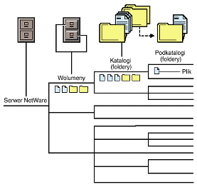 W oknie narzędzia NEAT (Novell® Easy Administration ToolTM) na szczycie struktury systemu plików przedstawionej w widoku katalogu znajduje się obiekt wolumenu. Niżej można umieszczać katalogi, podkatalogi oraz pliki, np. pliki danych lub aplikacji.