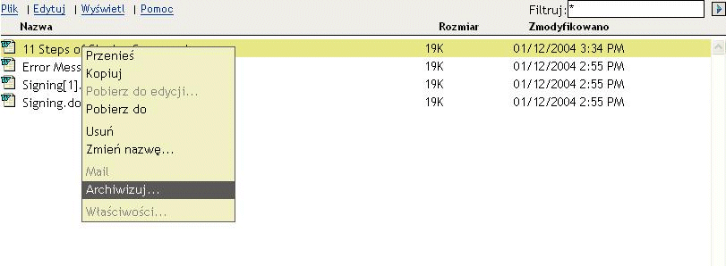 Jako przykład przyjmijmy sytuację, w której użytkownik chce odnaleźć starszą wersję pliku "11 kroków skutecznego podpisywania.doc". W tym celu najpierw należy kliknąć plik prawym przyciskiem myszy w interfejsie programu NetStorage, a następnie kliknąć polecenie Archive (Archiwum), co pokazano na rysunku poniżej. Patrz: Rysunek 4. Zestaw wersji pliku w katalogu "guest" nie zawierał wersji pliku wymaganej przez użytkownika.