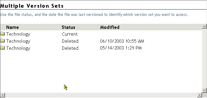 W oknie dialogowym Multiple Version Sets (Zestawy wielu wersji) jest wyświetlana lista wielu instancji wersji wybranego pliku lub katalogu. Na liście są widoczne tylko te pliki i katalogi, do których użytkownik ma uprawnienia.