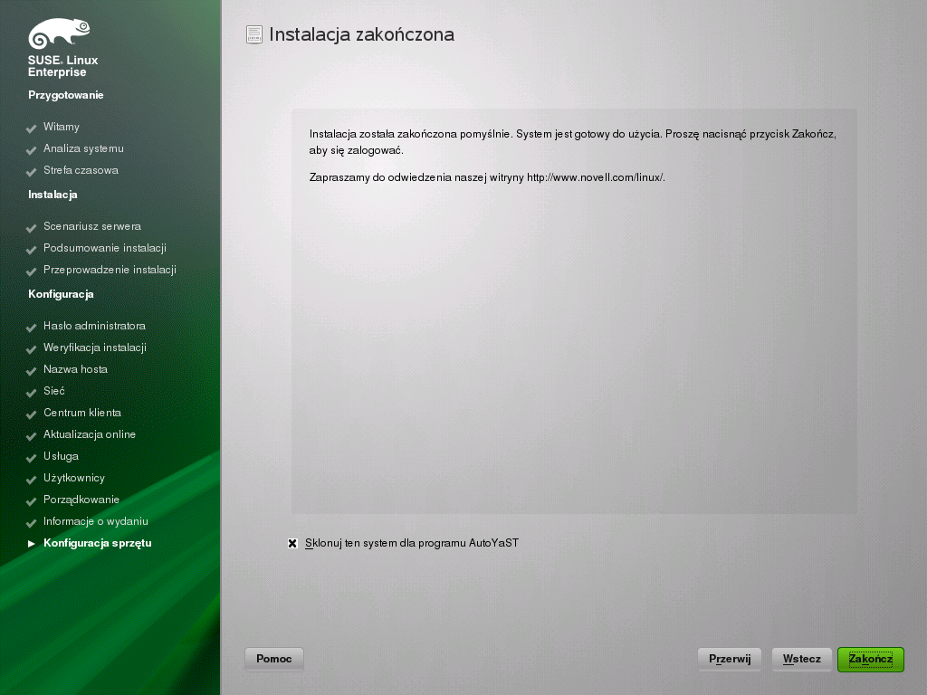 Na ekranie Instalacja zakończona należy kliknąć przycisk , aby zamknąć program instalacyjny systemu i przejść do ekranu logowania.