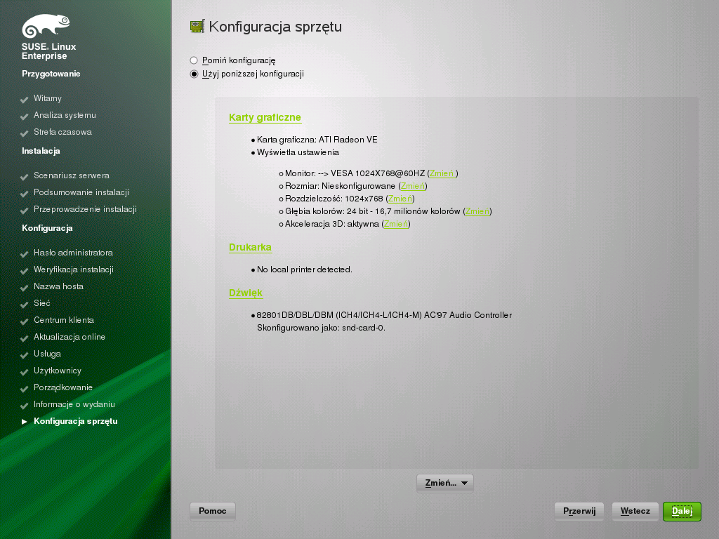 Ekran Konfiguracja sprzętu służy do przeglądania lub konfigurowania karty graficznej i innych urządzeń. Proszę kliknąć przycisk , aby kontynuować.