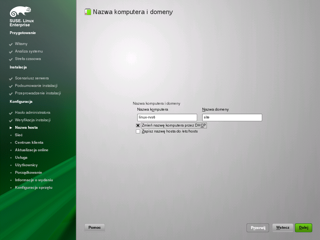 Następnie należy wprowadzić nazwę komputera i domenę DNS, do której on należy. Proszę kliknąć przycisk , aby kontynuować.