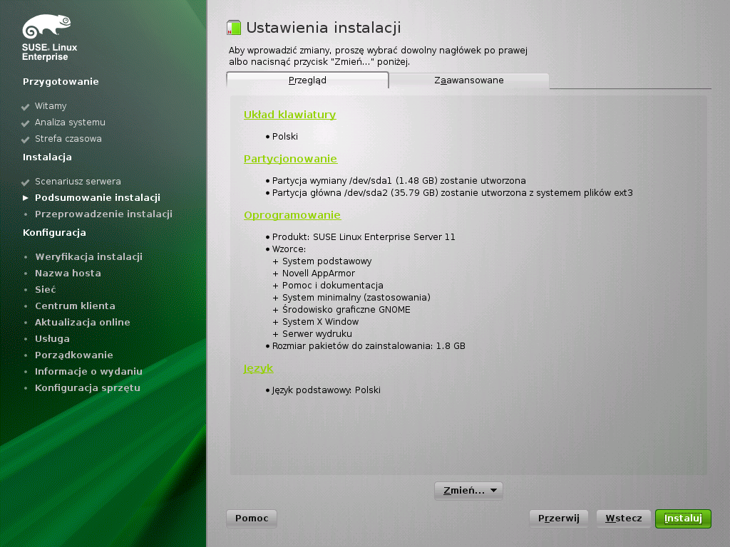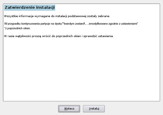 Okna Ustawienia instalacji można użyć do przeglądu zaproponowanych opcji instalacji i partycjonowania oraz do zmian poszczególnych opcji w razie potrzeby.