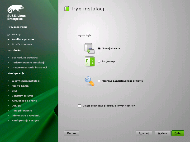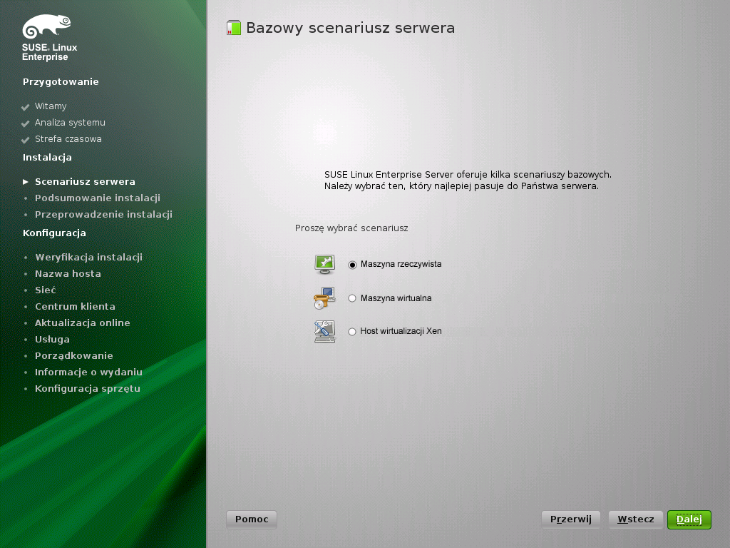 Trzeba zadecydować, czy ma być wykonana instalacja jako podstawowego systemu operacyjnego (opcja ), jako maszyny wirtualnej (gościa) w monitorze maszyn wirtualnych XEN (wybierając opcję ) czy jako hosta wirtualizacyjnego, który może uruchamiać inne maszyny wirtualne (poprzez wybór opcji ). Proszę kliknąć przycisk , aby kontynuować.