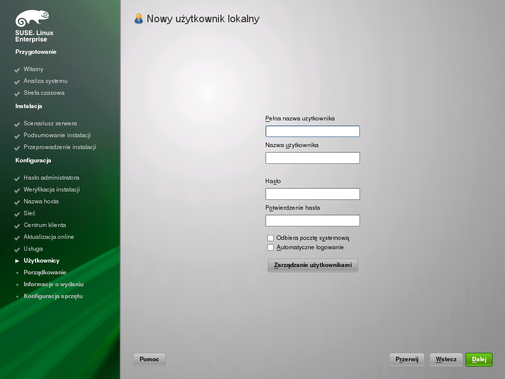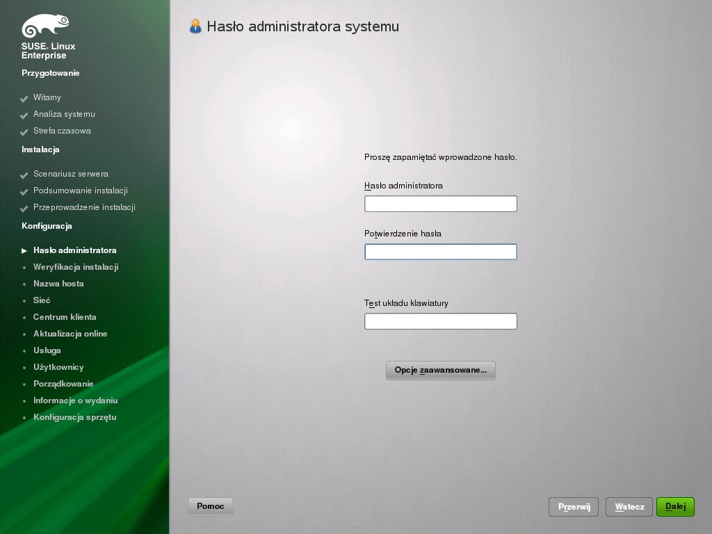 Hasła użytkownika root nie wolno zapomnieć! Po jego wprowadzeniu tutaj nie może być odzyskane. Można je ustawić na nowo tylko z pomocą administratora. Proszę kliknąć przycisk , aby kontynuować.