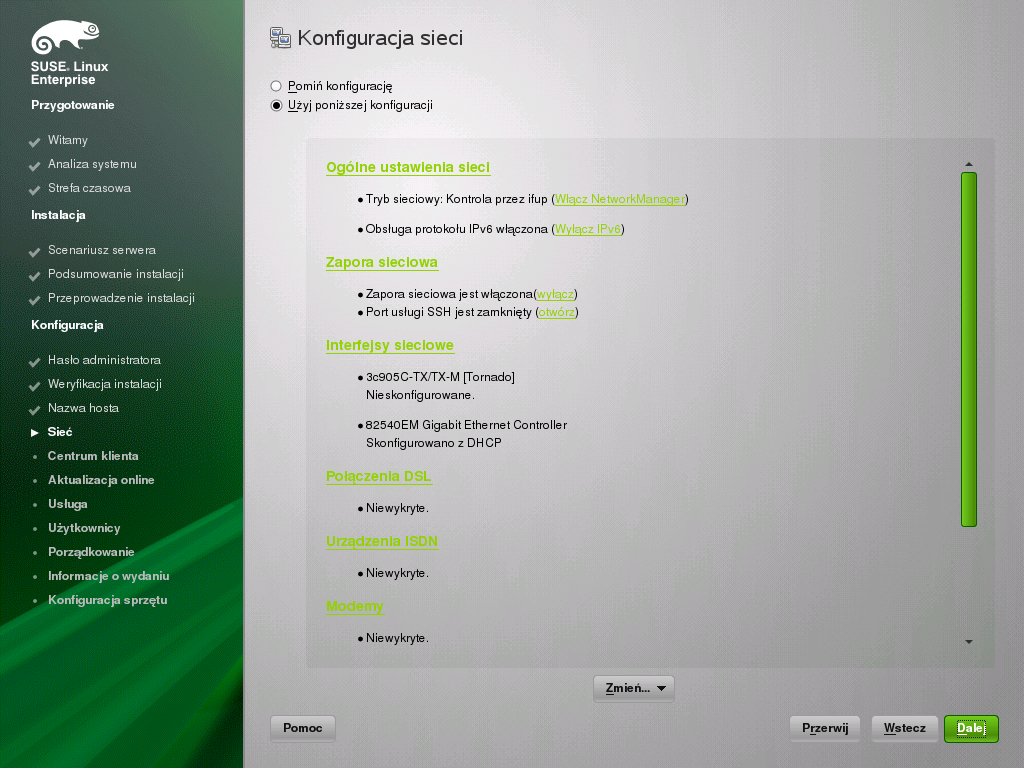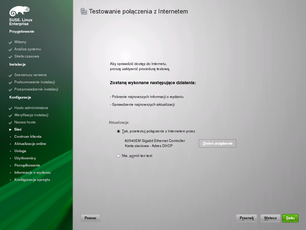Jeśli komputer ma urządzenia sieciowe (np. kartę sieciową albo bezprzewodową, połączenie DSL, kartę ISDN lub modem), dobrze jest skonfigurować je teraz, ponieważ połączenie z Internetem pozwala systemowi pobrać wszelkie dostępne aktualizacje i dołączyć je do instalacji. Proszę kliknąć przycisk , aby kontynuować.