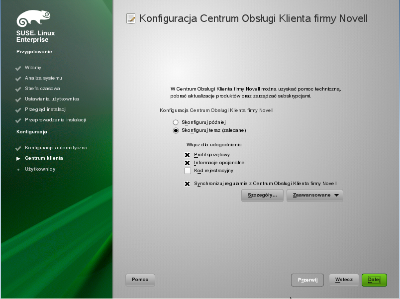 W oknie Konfiguracja Centrum Obsługi Klienta firmy Novell można zezwolić systemowi na aktualizacje online, klikając opcje .