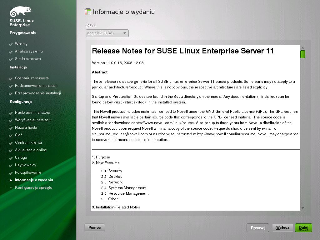 Po zakończeniu konfiguracji systemu można obejrzeć Informacje o wydaniu. Proszę kliknąć przycisk , aby kontynuować.