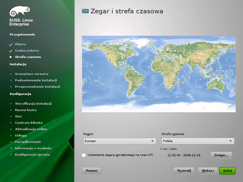 Proszę wybrać strefę czasową używaną dla danego komputera. Proszę kliknąć przycisk , aby kontynuować.
