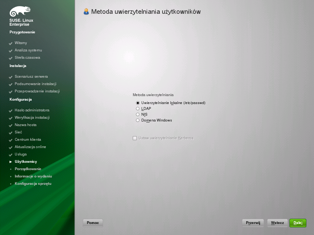 Na ekranie Metoda uwierzytelniania użytkowników należy kliknąć przycisk radiowy , o ile nie otrzymano innych instrukcji od administratora systemu. Proszę kliknąć przycisk , aby kontynuować.