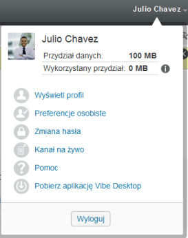 UWAGA:Jeśli informacji osobistych (np. hasła do systemu Vibe) nie można zmodyfikować w sposób opisany w tej sekcji, prawdopodobnie oznacza to, że informacje osobiste są synchronizowane z zewnętrznym serwerem katalogu. W celu wprowadzenia zmian należy skontaktować się z administratorem systemu Vibe.