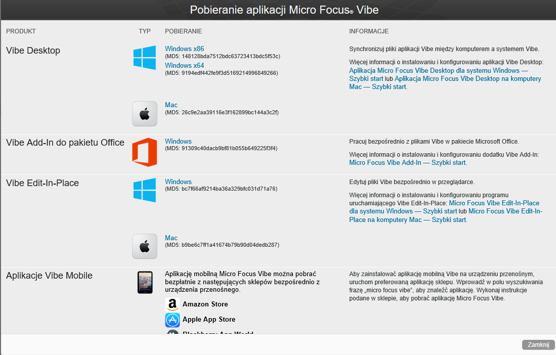 (Konfigurowanie aplikacji Vibe Desktop dla wszystkich użytkowników) w dokumencie Micro Focus Vibe 4.0.7 Administration Guide (Podręcznik administratora systemu Micro Focus Vibe 4.0.7).