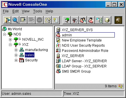 No ConsoleOneTM, a rede e seus recursos são apresentados como um conjunto de objetos organizados em vários containers, com Meu mundo no topo. Utilize o painel esquerdo para expandir e comprimir containers. Utilize o painel direito para trabalhar com recursos específicos.