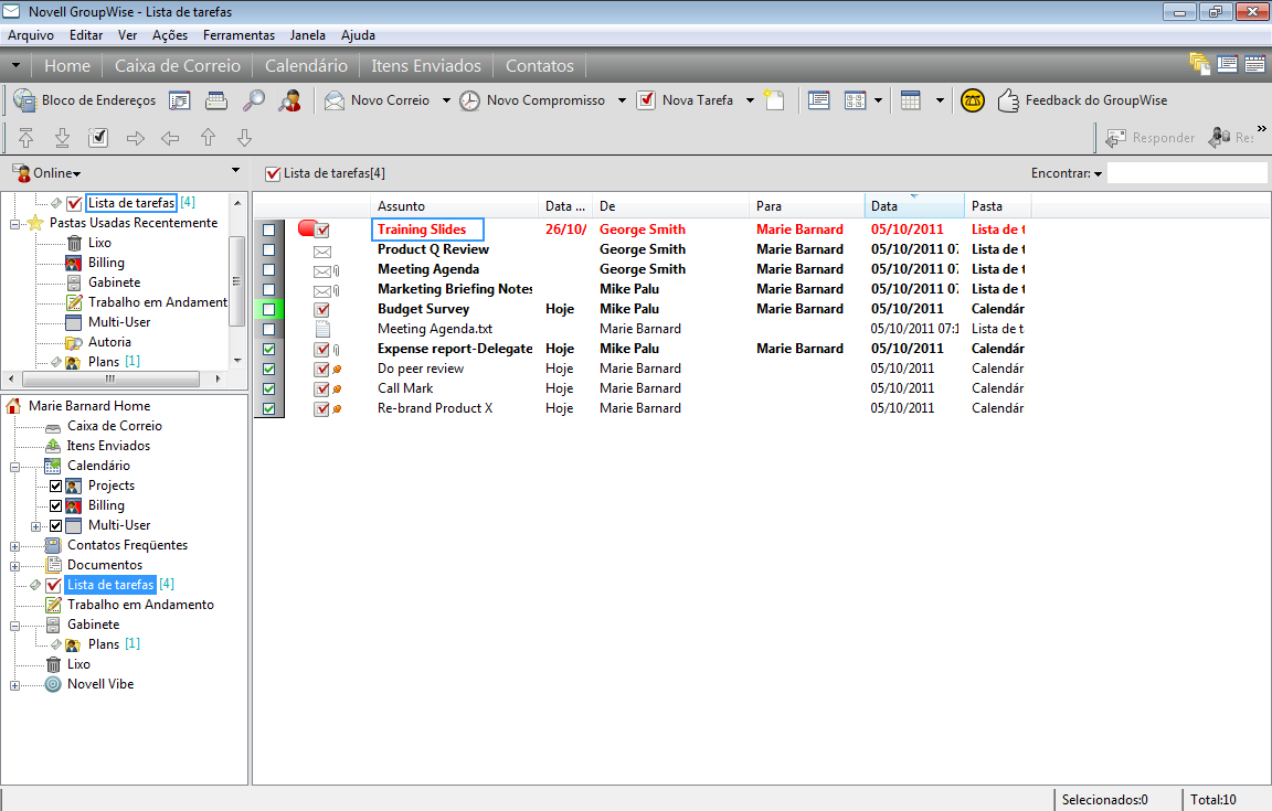 A pasta Lista de Tarefas é uma pasta do sistema usada para controlar as tarefas do GroupWise e outros itens que requerem alguma ação. Considere-a como uma lista master de todas as suas tarefas.