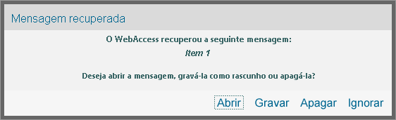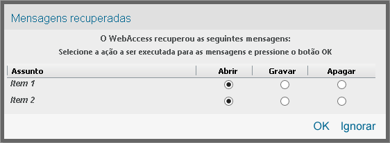 Clique em Ignorar para manter as mensagens gravadas no disco, mas não as recuperar no WebAccess. Da próxima vez que você iniciar o WebAccess, a janela Gravação Automática aparecerá novamente.