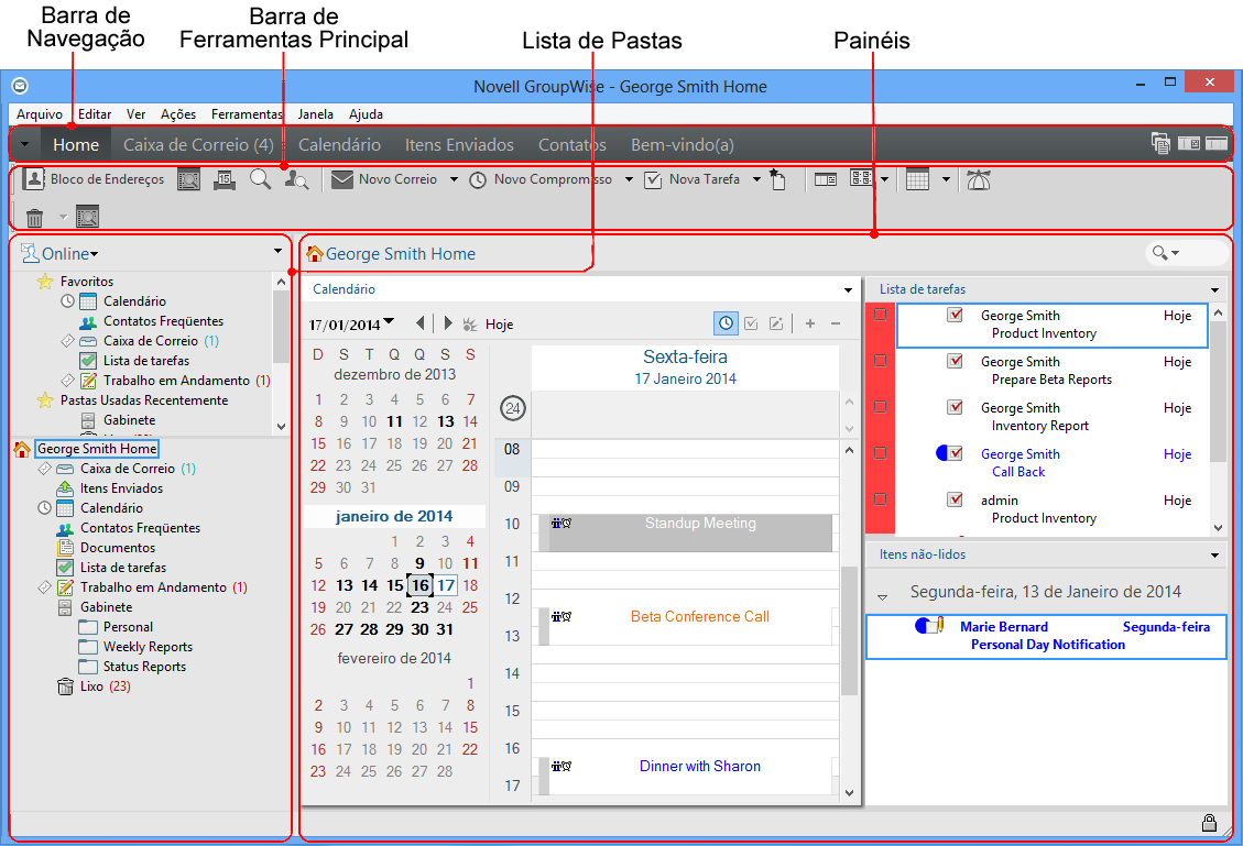 A área de trabalho principal do GroupWise é chamada Janela Principal. Na Janela Principal, é possível ler mensagens, programar compromissos, ver o Calendário, gerenciar contatos, mudar o modo de execução do GroupWise, abrir pastas, abrir documentos etc.
