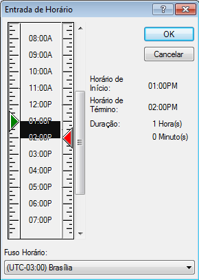Use a seta verde para selecionar um horário de início e a seta vermelha para selecionar um horário de término. Os horários selecionados são exibidos na lateral direita da tela. É possível usar intervalos mínimos de 15 minutos.