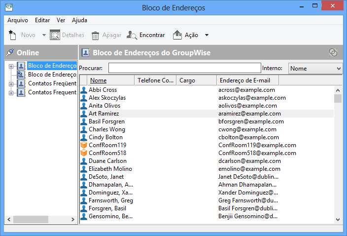 na barra de ferramentas da Janela Principal. O painel esquerdo lista o Bloco de Endereços do GroupWise, o bloco de endereços LDAP, o bloco de endereços Contatos Frequentes e quaisquer blocos de endereços pessoais que você tenha criado.