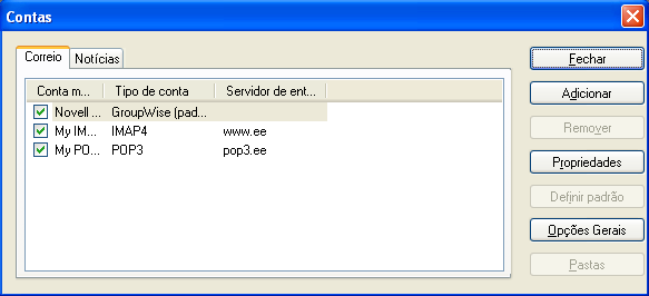 O menu Contas na Janela Principal do GroupWise permite acessar recursos de conta, como adicionar uma conta, definir propriedades da conta, além de enviar e recuperar itens das contas de correio da Internet.