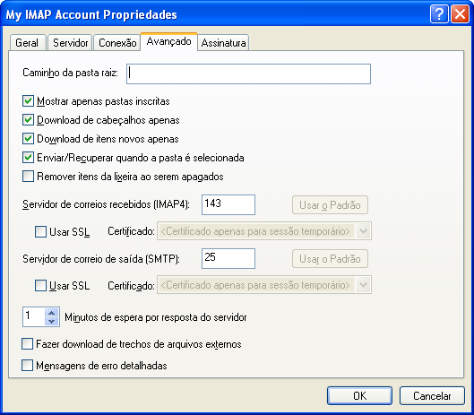 Clique na conta IMAP4 e, em seguida, clique em Propriedades.
