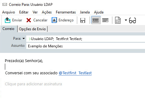 No exemplo mostrado abaixo, o redator da mensagem adicionou "Usuário LDAP" ao campo Para e o tratou como "Senhor" no corpo da mensagem. Ao digitar a primeira frase, o redator da mensagem digitou "@test" e pôde selecionar o usuário TestFirst TestLast na lista popup do Bloco de Endereços para Complementação de Nome. Essa última ação inseriu o nome do destinatário com link no corpo da mensagem e adicionou esse usuário ao campo Para do item de Correio.