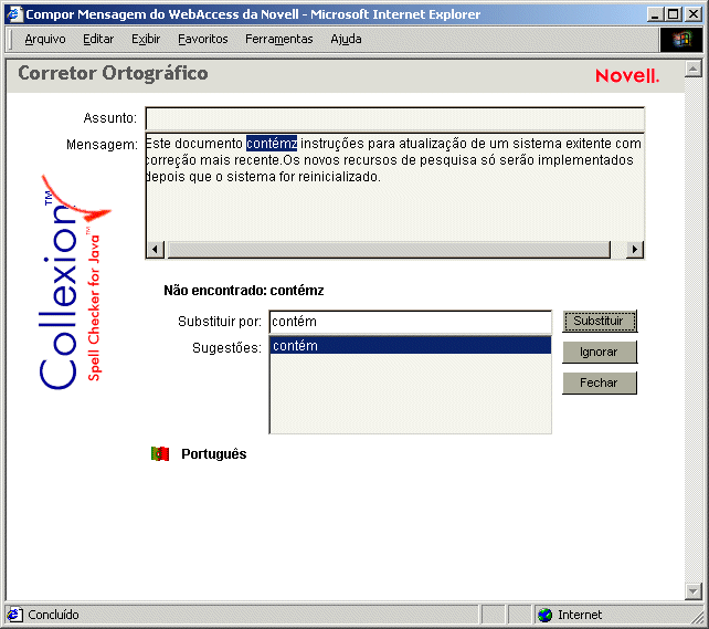 O Corretor Ortográfico permite verificar palavras incorretas nas mensagens criadas. O Corretor Ortográfico do WebAccess é um Java Applet. Isso significa que, para usar o Corretor Ortográfico, o browser precisa estar habilitado para Java.