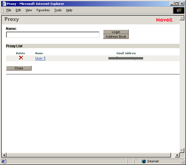 Se você souber o endereço completo do GroupWise (ID_de_usuário.agência_postal.domínio) da pessoa em cuja Caixa de Correio você deseja atuar como proxy, digite o endereço no campo Nome e clique em Login.