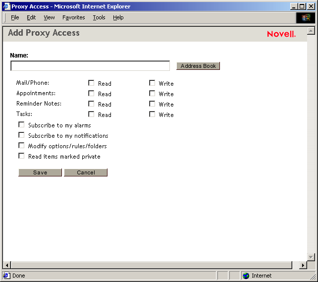 O acesso de proxy permite que o proxy abra a Caixa de Correio da outra pessoa, desde que tenha efetuado login em sua Caixa de Correio, sem conhecer o ID de usuário do GroupWise e a senha da Caixa de Correio dessa pessoa. Esse acesso também estabelece os direitos que o proxy terá na Caixa de Correio. Os direitos de um proxy determinam até que ponto o proxy poderá gerenciar a Caixa de Correio de uma pessoa. Por exemplo, o proxy poderá receber direitos para ler e gravar (enviar) todos os tipos de item ou receber direitos para ler apenas itens do Calendário (compromissos, lembretes e tarefas).