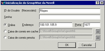 Ao iniciar o GroupWise, você poderá ser solicitado a digitar informações, como senha, endereço TCP/IP do agente postal, etc. A caixa de diálogo Inicialização muda de acordo com as informações que o GroupWise precisa para abrir a Caixa de Correio e com o modo do GroupWise em que você efetua o login.