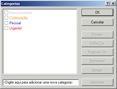 Quatro categorias padrão (Continuação, Baixa Prioridade, Pessoal e Urgente) estão disponíveis para serem imediatamente designadas aos itens. Se quiser, você poderá modificá-las e apagá-las, assim como continuar criando novas categorias.