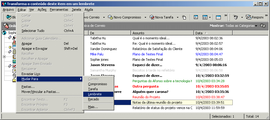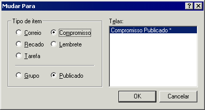 Você pode usar Mudar Para para converter um item de sua Caixa de Correio em outro tipo de item. Por exemplo, você pode transformar uma mensagem de correio da Caixa de Correio em um compromisso do Calendário. O novo compromisso conterá todas as informações da mensagem de correio (como as listas Para, CC e CO, o assunto e o texto da mensagem) aplicáveis a ele.