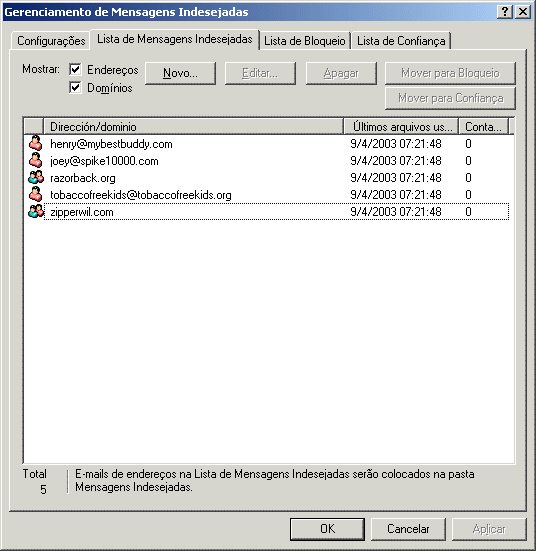 Nenhum item futuro desse endereço de e-mail ou desse domínio da Internet será bloqueado ou entregue na pasta Mensagens Indesejadas, independentemente do que seja especificado na Lista de Bloqueio e na Lista de Mensagens Indesejadas.