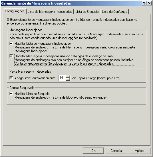 Todos os itens futuros de endereços de e-mail que não estejam no bloco de endereços Contatos Freqüentes e outros blocos de endereços pessoais serão entregues na pasta Mensagens Indesejadas. Você pode especificar que os itens dessa pasta sejam apagados após <n> dias.