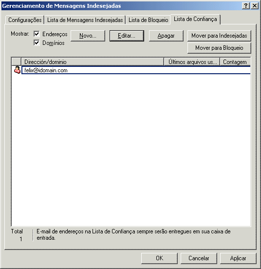 Além da Lista de Bloqueio e da Lista de Mensagens Indesejadas, há a Lista de Confiança. Use essa lista para adicionar endereços de e-mail ou domínios de Internet que você não deseja bloquear ou tornar indesejados, independentemente do que esteja especificado nas outras duas listas. Por exemplo, suponhamos que empresaz.com esteja em sua Lista de Bloqueio, mas que você tenha um amigo cujo endereço seja meuamigo@empresaz.com. Nesse caso, adicione o endereço de e-mail desse amigo à Lista de Confiança.