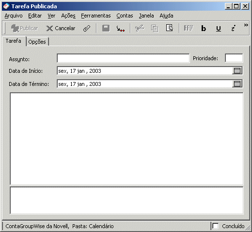Depois de concluir uma tarefa, você poderá marcá-la como Concluída. Como originador de uma tarefa designada, você poderá receber uma notificação do GroupWise quando ela for marcada como Concluída. (É preciso que o Notify esteja sendo executado para que você receba a notificação.) O status Concluído, incluindo a data e o horário em que a tarefa foi marcada como tal, é colocado na janela Propriedades.