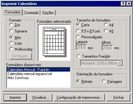 Use Imprimir Calendário para imprimir compromissos, tarefas e lembretes em formatos diferentes e em diversos tamanhos de páginas.