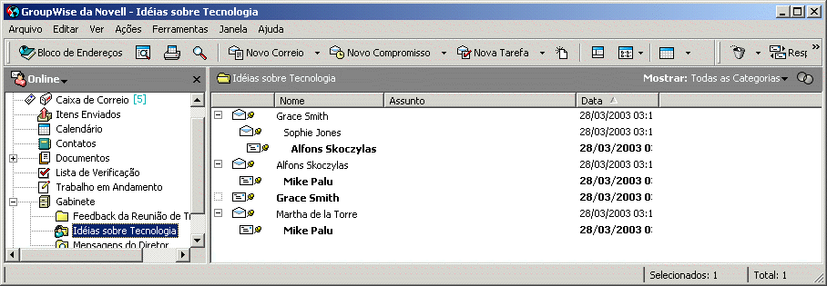 Uma pasta compartilhada é igual a qualquer outra pasta do Gabinete; no entanto, ao contrário das demais pastas, outras pessoas têm acesso às pastas compartilhadas e elas aparecem no Gabinete dessas pessoas. Você pode criar pastas compartilhadas ou compartilhar pastas pessoais existentes no Gabinete. Escolha com quem compartilhar a pasta e quais direitos conceder a cada usuário. Os usuários podem publicar mensagens nas pastas compartilhadas, arrastar itens existentes para a pasta e criar processos de discussão. Você não pode compartilhar pastas do sistema. As pastas Calendário, Documentos, Caixa de Correio, Itens Enviados, Lista de Verificação Contatos, Gabinete, Trabalho em Andamento, Gerenciamento de Mensagens Indesejadas e Lixo são pastas do sistema. Em geral, uma pasta compartilhada apresenta o seguinte conteúdo: