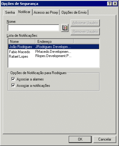 Você é associado automaticamente a alarmes e notificações. Se você anular a seleção de Associar a Alarmes e Associar a Notificações, não receberá mais alarmes e notificações. Você precisará repetir as etapas deste tópico para o seu nome de usuário.