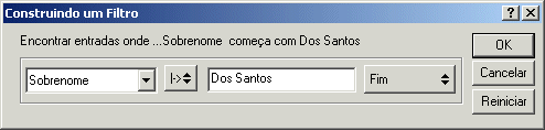 Você poderá encontrar facilmente entradas em um bloco de endereços se usar a Lista de Pesquisa. Também poderá especificar os critérios de pesquisa definindo um ou mais filtros. Por exemplo, é possível definir um filtro que mostre apenas as entradas com sobrenomes iniciados por "D".
