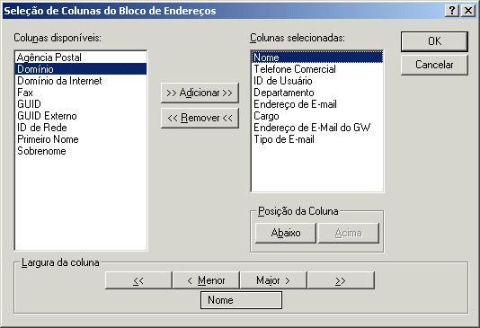 Os blocos de endereços contêm outras informações além das que podem ser mostradas em uma única vez. Você pode mudar as informações que são mostradas a qualquer momento, selecionando diferentes marcadores de colunas. Você também pode mudar a ordem e a largura das colunas, bem como ordená-las.