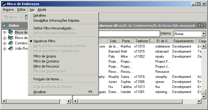 Use os filtros predefinidos no menu Ver para mostrar somente grupos, usuários, organizações ou recursos em um bloco de endereços.