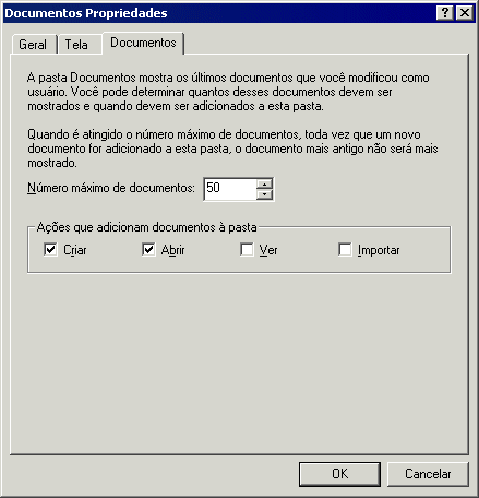 A pasta Documentos contém, por padrão, as últimas 20 referências de documento. Você pode mudar esse número para um número que varie de 0 a 5.000 referências de documento. Depois que o número máximo for atingido, a referência de documento mais antiga será apagada. Você também pode apagar manualmente as referências de documento da pasta Documentos. A exclusão de uma referência de documento não afeta o documento propriamente dito.