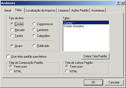 O GroupWise marca o item como padrão colocando um asterisco (*) junto ao nome da tela na caixa Telas.