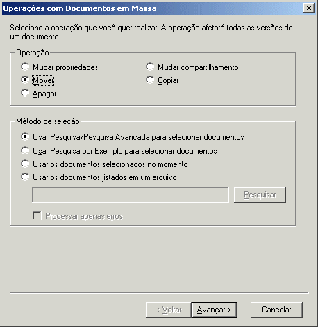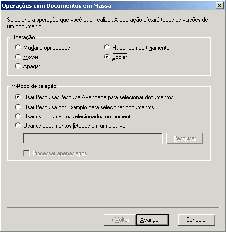 Quando usar o recurso Encontrar no Assistente de Operações de Documentos em Massa para especificar os documentos que deseja mover, copiar, apagar ou mudar, você poderá clicar no botão Visualizar (na última caixa de diálogo do assistente) para ver uma lista dos documentos que serão movidos, copiados, apagados ou mudados com base nos critérios especificados em Encontrar. Esse procedimento permite revisar esses resultados, verificar se os critérios são precisos e selecionar os documentos corretos. Se os critérios não forem precisos, você poderá voltar ao assistente e modificar os critérios especificados em Encontrar para expandir ou limitar os documentos incluídos na operação.
