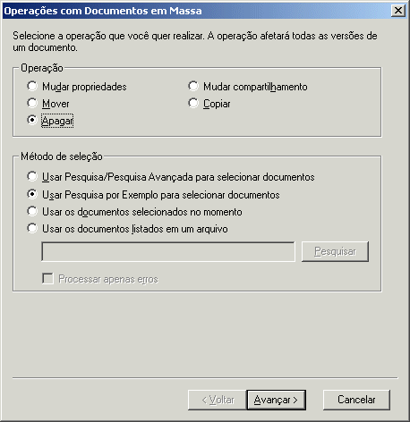Se o arquivo especificado for um arquivo de registro de uma operação de exclusão anterior, clique em Processar Apenas Erros para que o GroupWise só processe os documentos que geraram erros durante a sessão anterior.